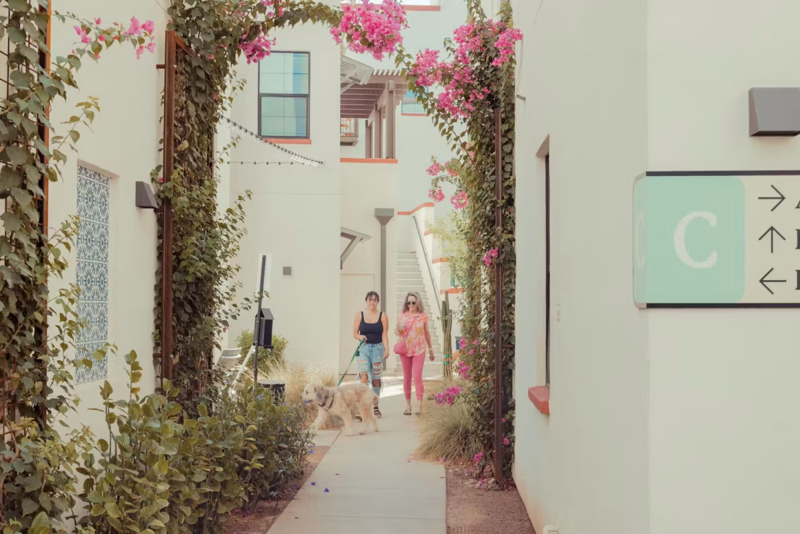 The architectural charm of Culdesac is impossible to miss—white stucco buildings, winding pedestrian paths, and lush courtyards adorned with vibrant public art create a sense of place that feels both modern and timeless.